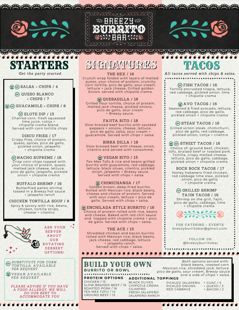 Build your own burrito bowl! Choose your protein and toppings below. All dishes served with black beans, roasted corn, Mexican rice, shredded jack, lettuce, pico de gallo, sour cream, Breezy sauce. Served with chips + salsa.