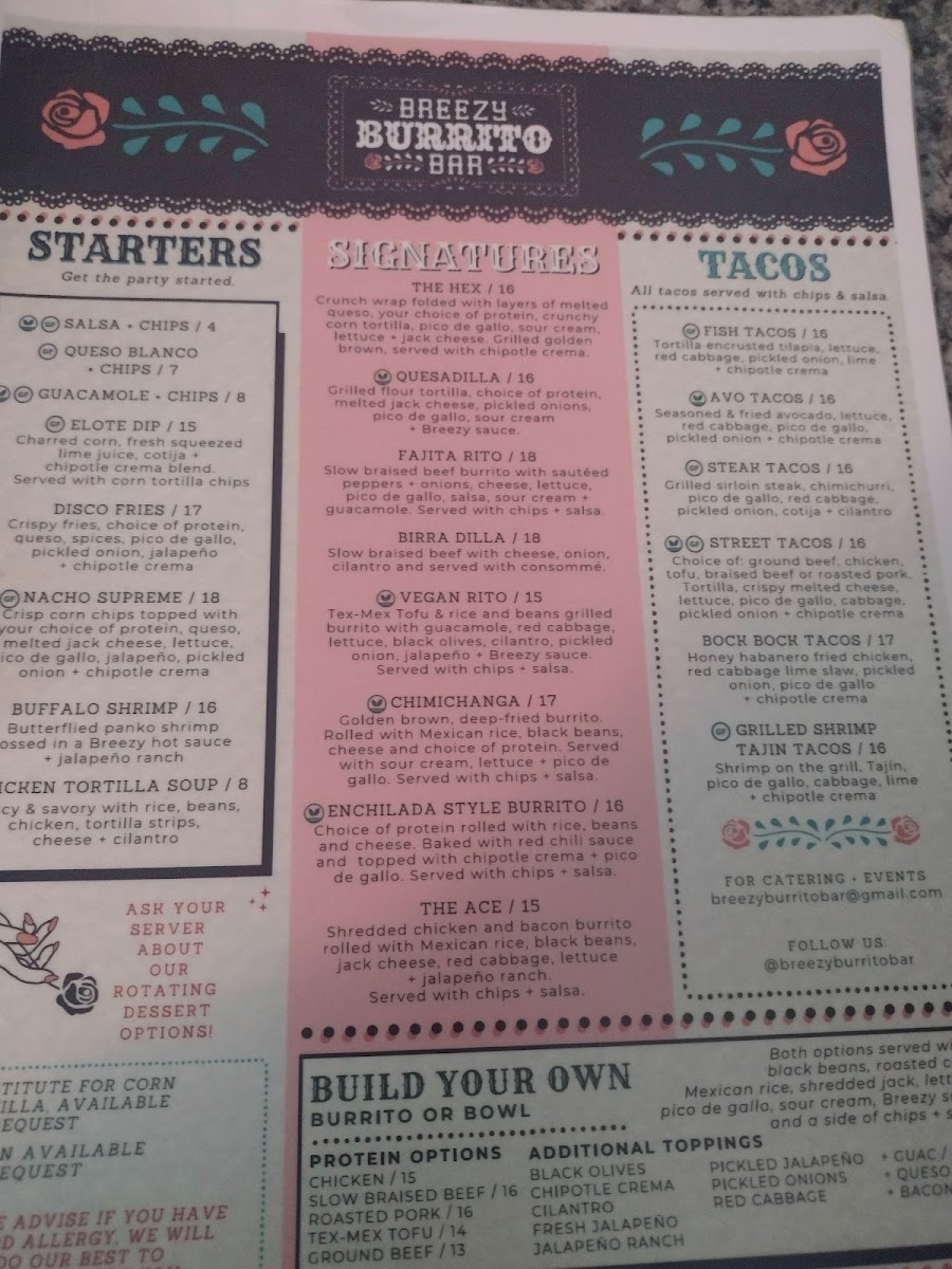Build your own burrito! Choose your protein and toppings below. All dishes served with black beans, roasted corn, Mexican rice, shredded jack, lettuce, pico de gallo, sour cream, Breezy sauce. Served with chips + salsa.